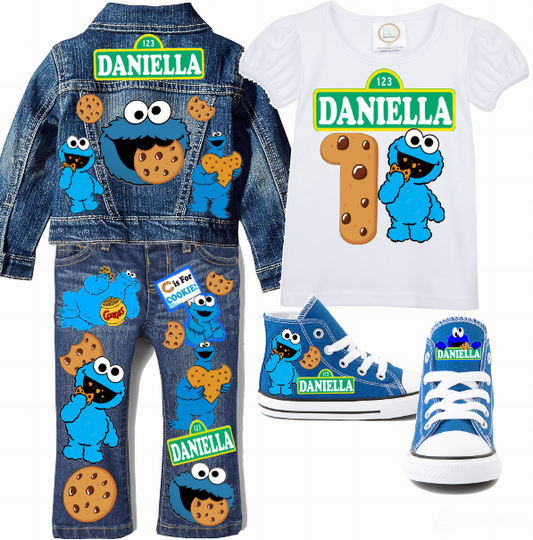 Cookie Monster Girls denim outfit-Cookie Monster Denim Set-Cookie Monster Birthday outfit-Cookie Monster Jean outfit