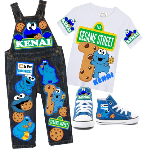 Cookie Monster overalls- Cookie Monster outfit- Cookie Monster birthday shirt- Cookie Monster birthday outfit