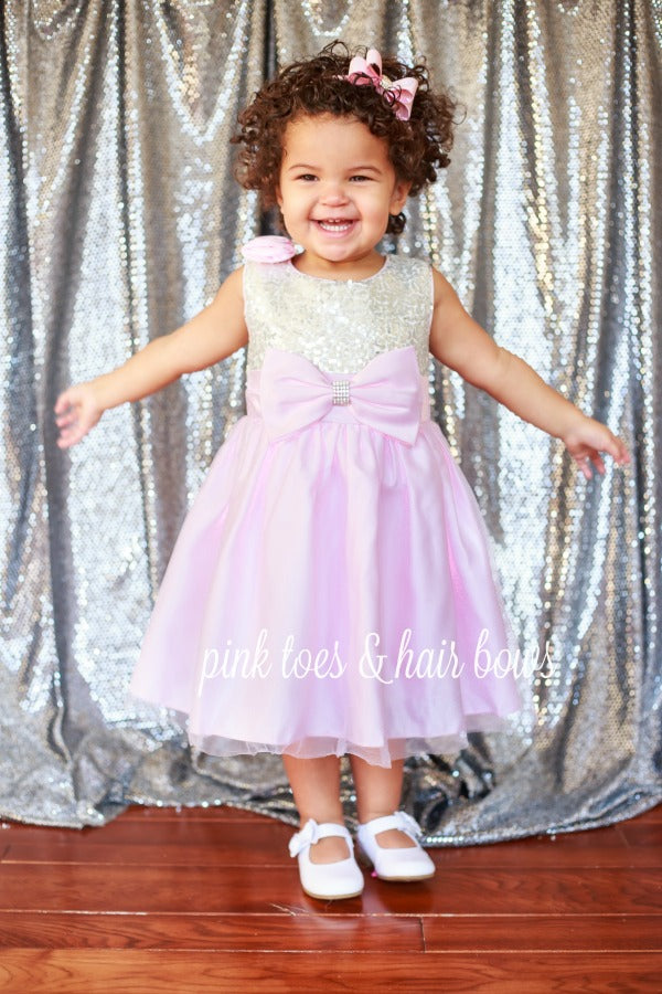 The beautiful Pink Sequin Bow Party Dress is perfect for your little one to wear at parties or special events,and photos. The bodice is detailed with silver sequin work that shines and sparkles,accented at the shoulder is lovely rose,and finished off with a satin bow sash,and accented bling. �The pastel pink skirt is pleated and oh so gorgeous